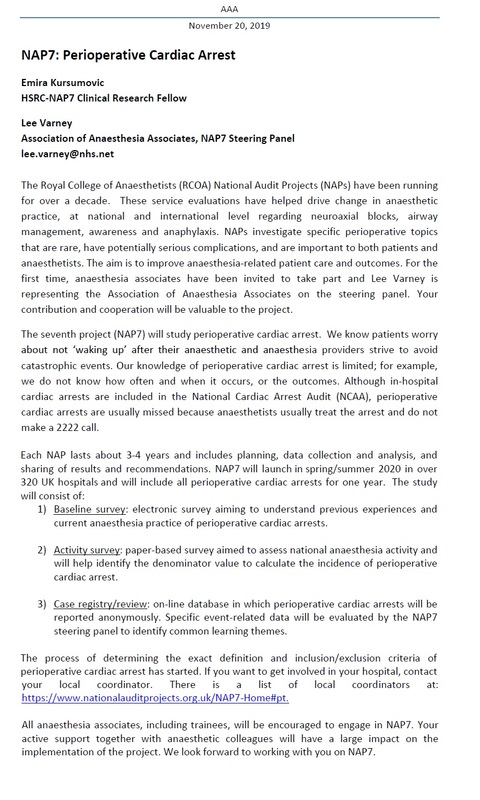 The National Audit Projects (NAPs) are internationally recognised reports that investigate different topics in relation to anaesthesia. AAA board member Lee Varney is representing AAs on the steering panel. The letter below from the Health Services Research Centre (HSRC) gives further information about this important future project and how AAs can support it.